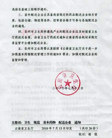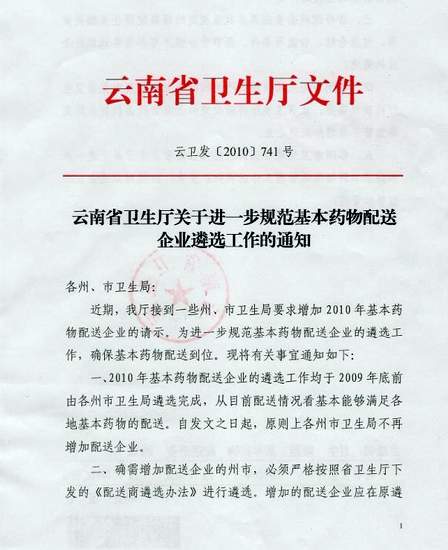 2010年云南省衛生廳關(guān)于進(jìn)一步規范基本藥物配送企業(yè)遴選工作通知